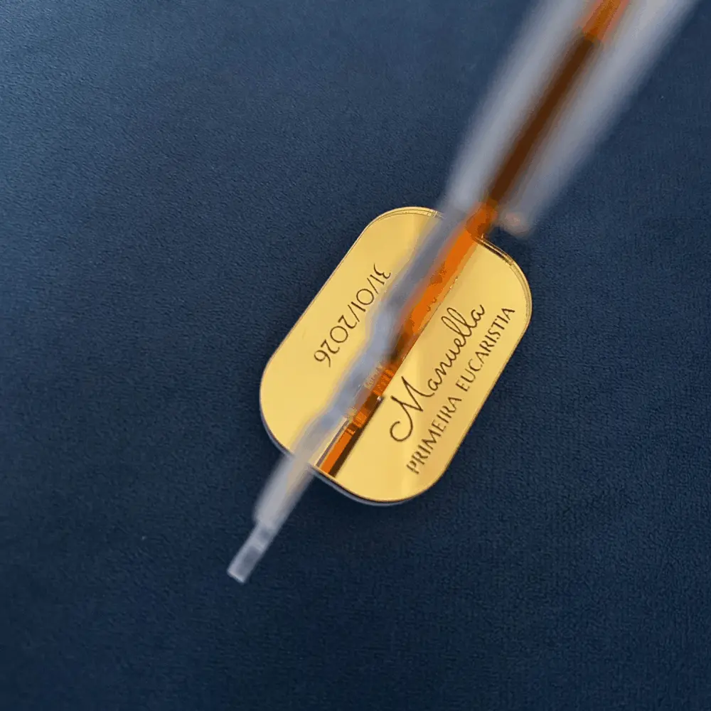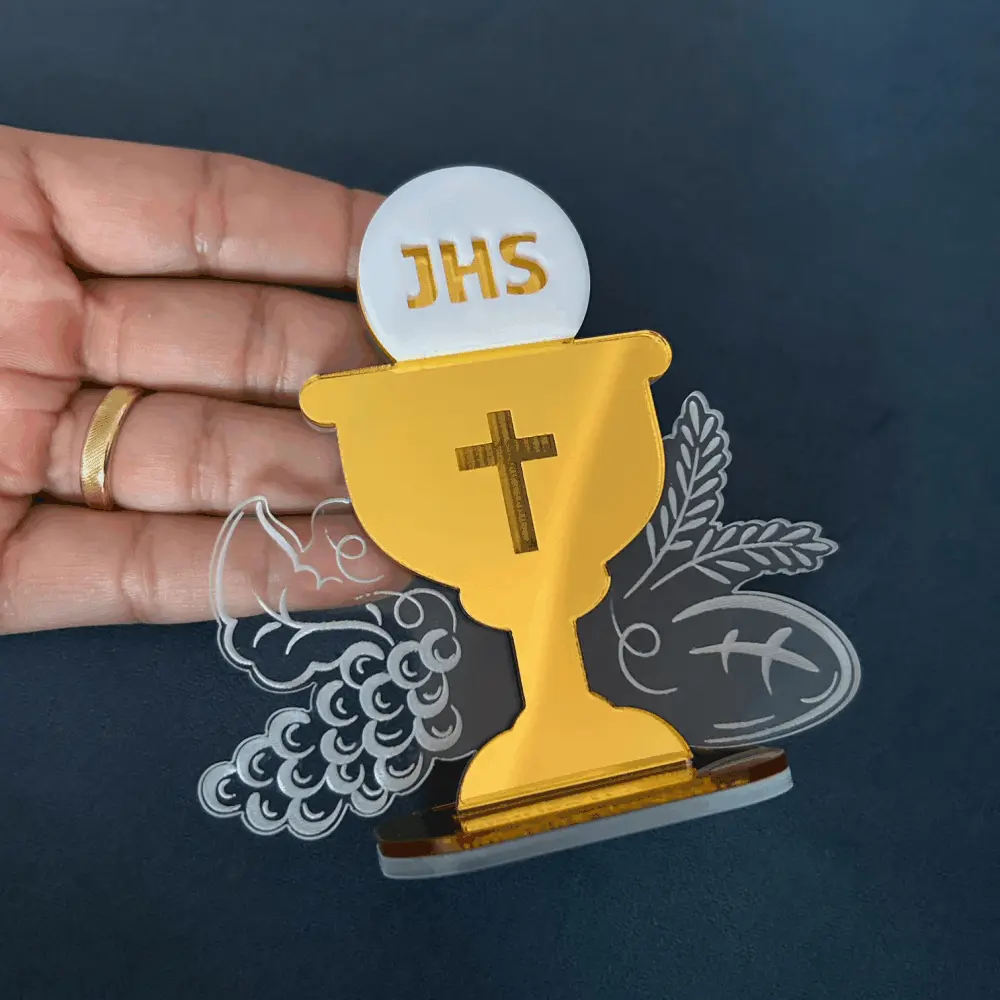 Mini Cálice em acrílico espelhado dourado, personalizado com gravação. Perfeito para lembrança de Primeira Comunhão/Eucaristia e Crisma.