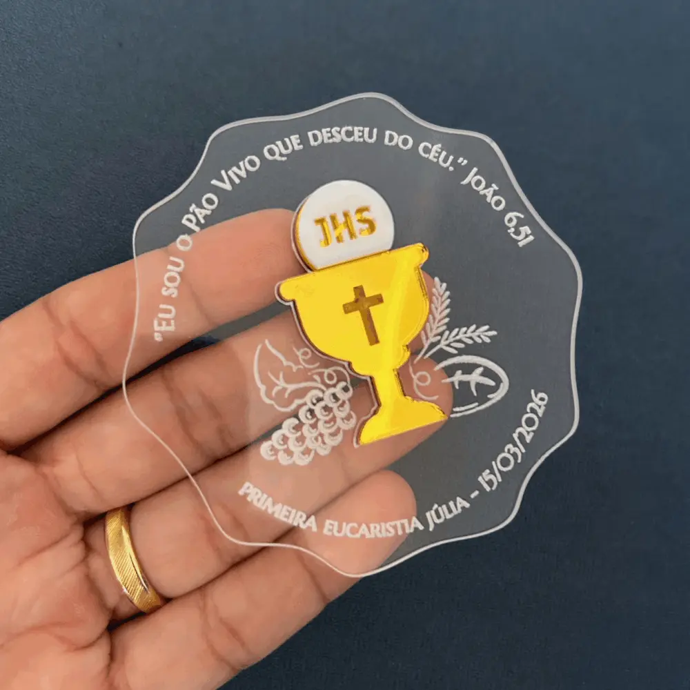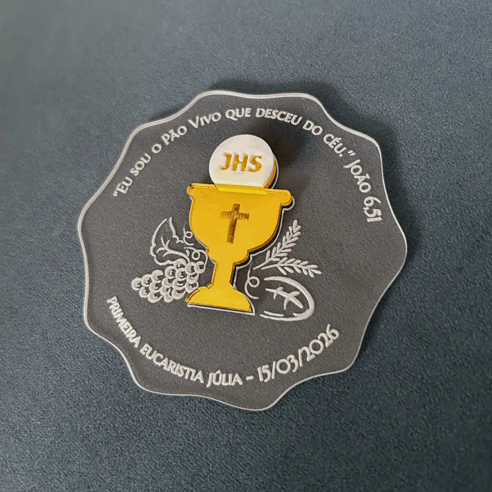 Ímã de acrílico cristal, personalizado com aplique e gravação. Perfeito para lembrança de Primeira Comunhão/Eucaristia ou Crisma.
