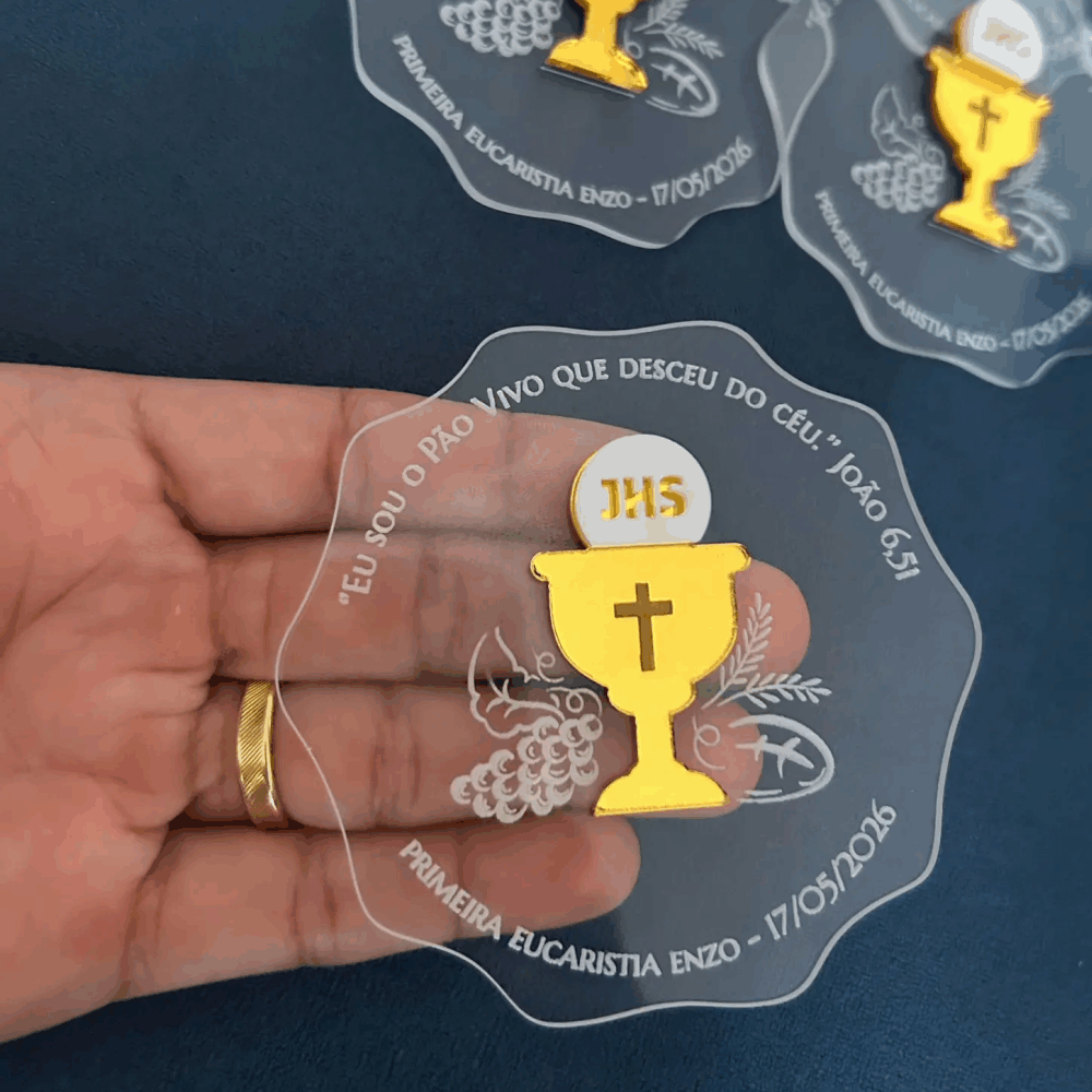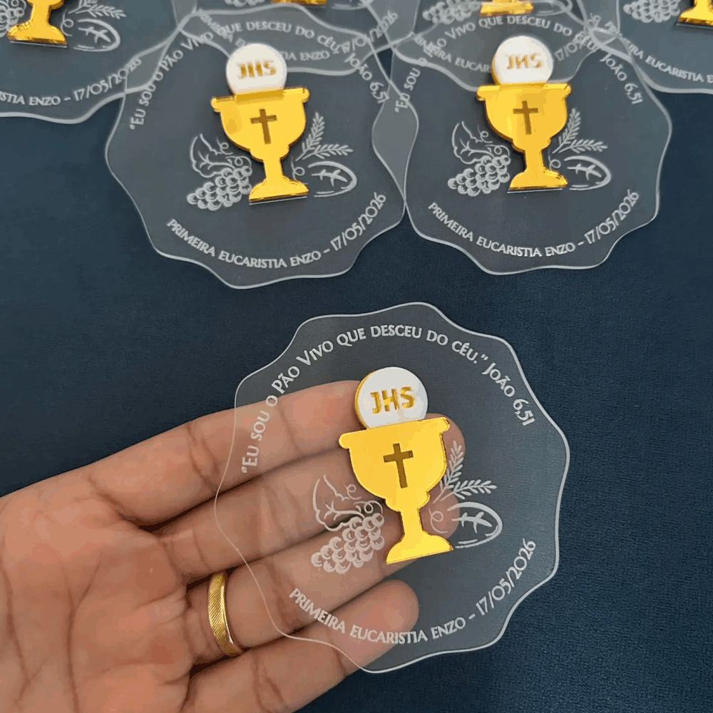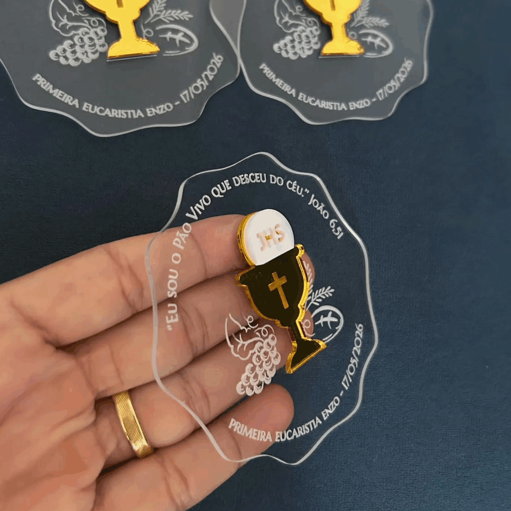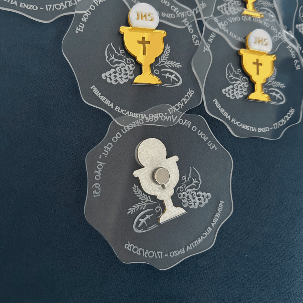 Ímã de acrílico cristal personalizado com aplique e gravação. Perfeito para lembrança de Primeira Comunhão/Eucaristia ou Crisma.