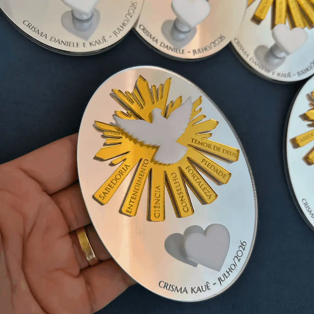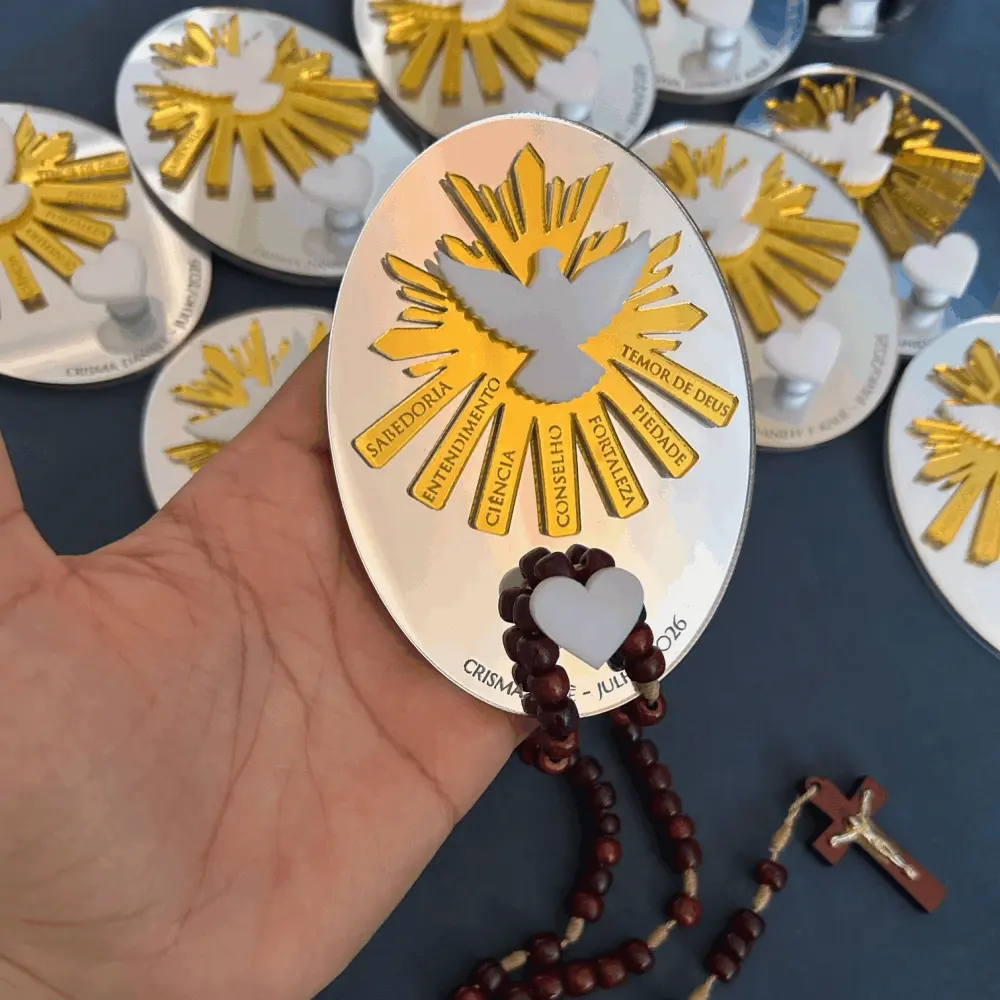 Suporte de Terço personalizado em acrílico espelhado, com gravação. Para fixar na parede e pendurar o terço do dia a dia. Acompanha fita dupla face no verso do suporte. Perfeito para lembrança de Batizado, Primeira Comunhão/Eucaristia e Crisma.