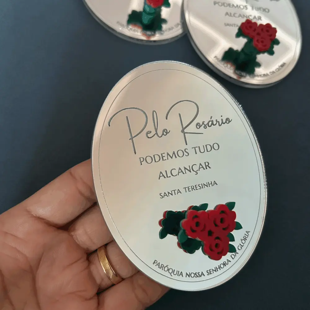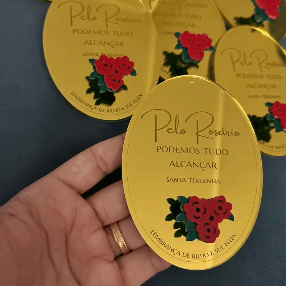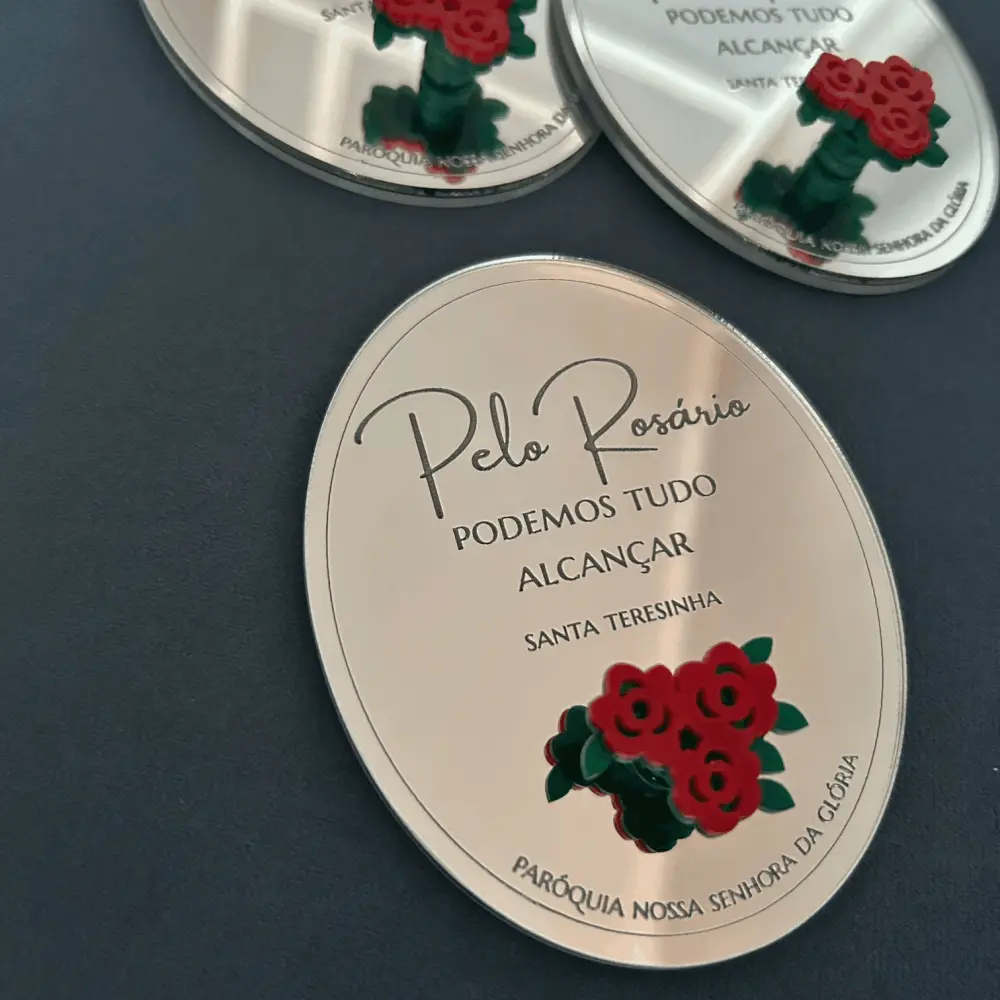 Suporte de Terço personalizado em acrílico espelhado, com gravação. Para fixar na parede e pendurar o terço do dia a dia. Acompanha fita dupla face no verso do suporte. Perfeito para lembrança de Batizado, Primeira Comunhão/Eucaristia e Crisma.