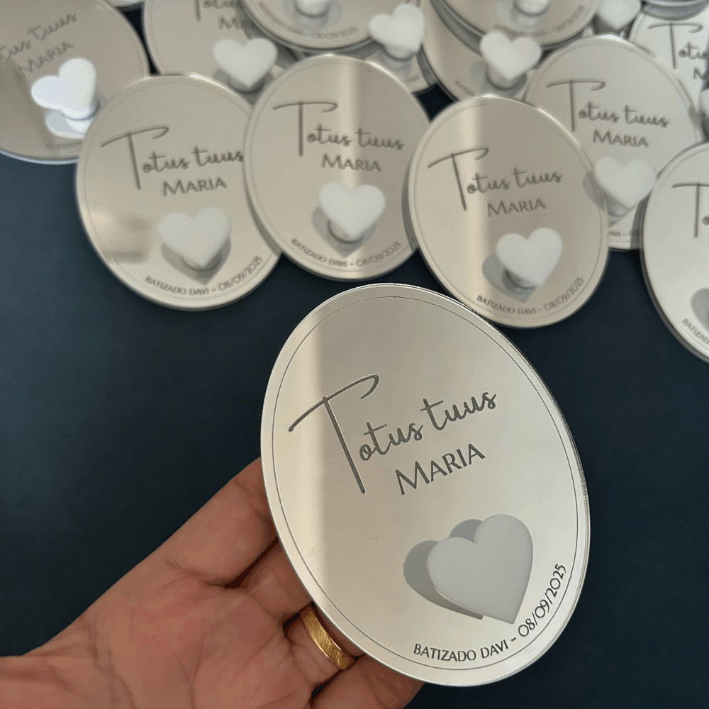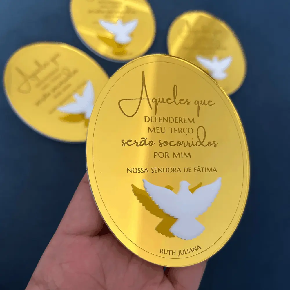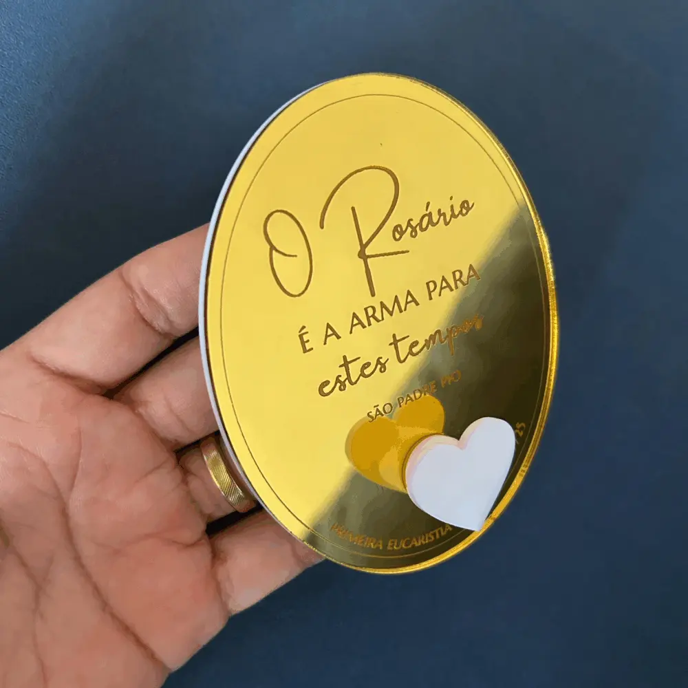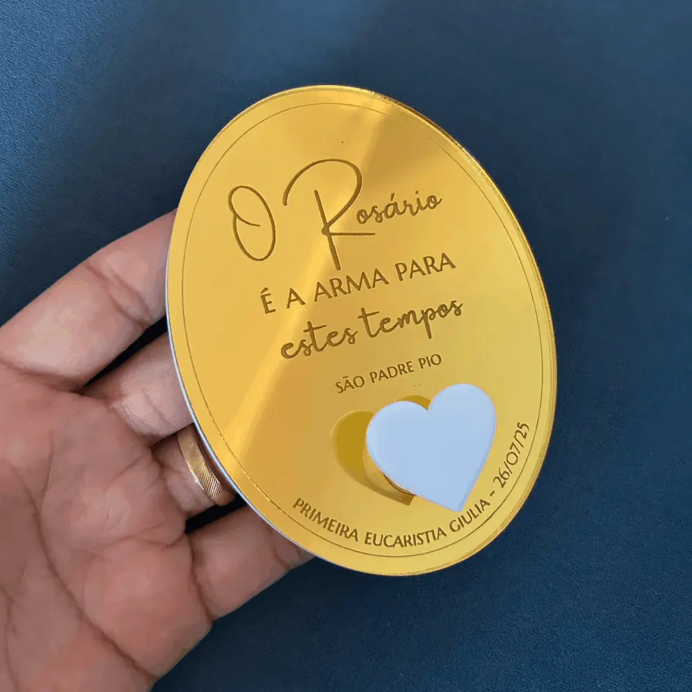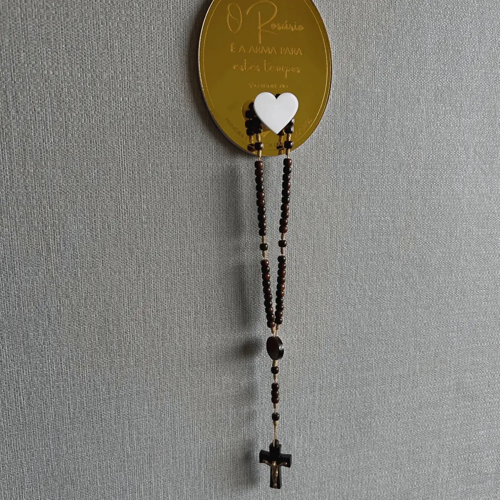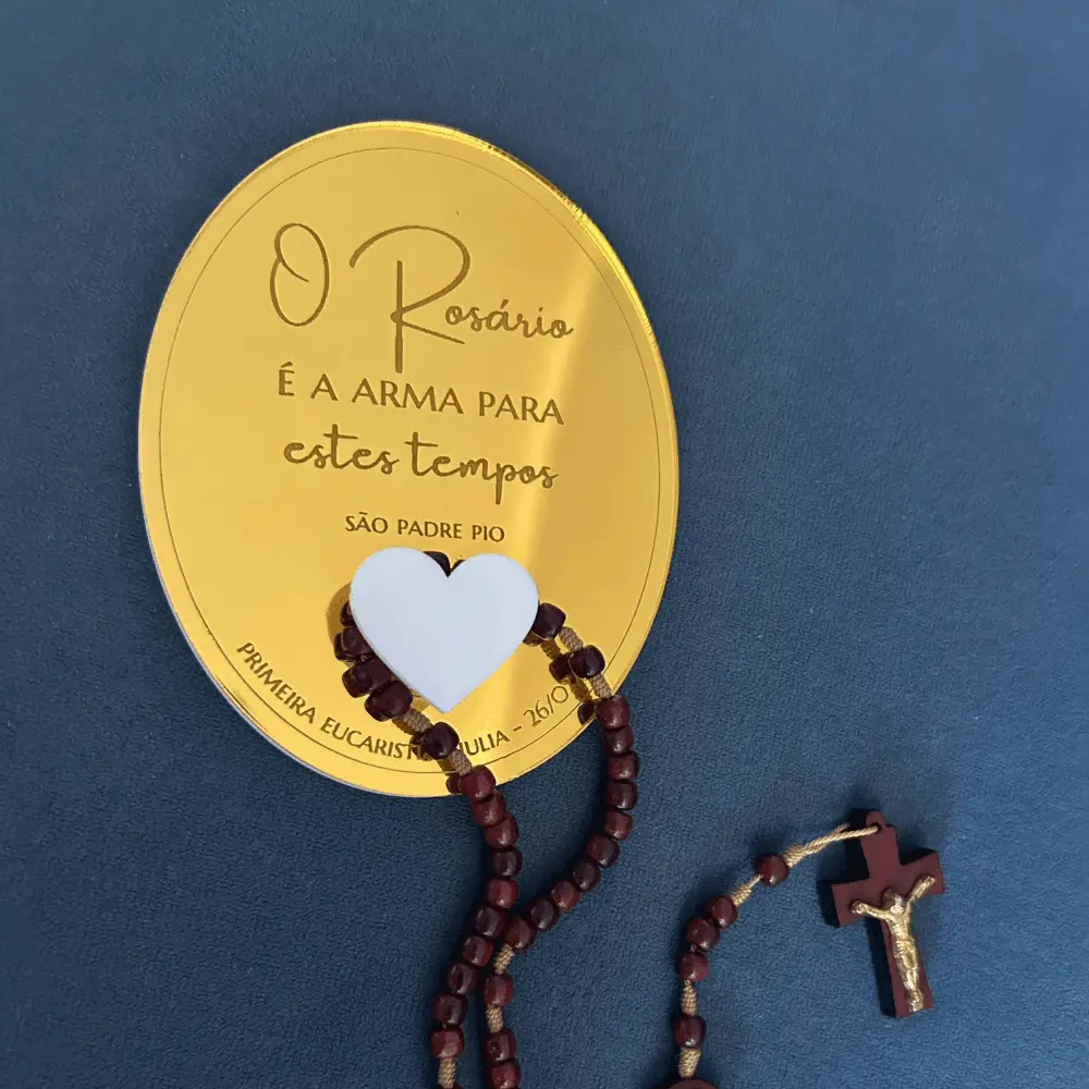 Suporte de Terço personalizado em acrílico espelhado e branco, com gravação. Para fixar na parede e pendurar o terço do dia a dia. Acompanha fita dupla face no verso do suporte. Perfeito para lembrança de Batizado, Primeira Comunhão/Eucaristia e Crisma.