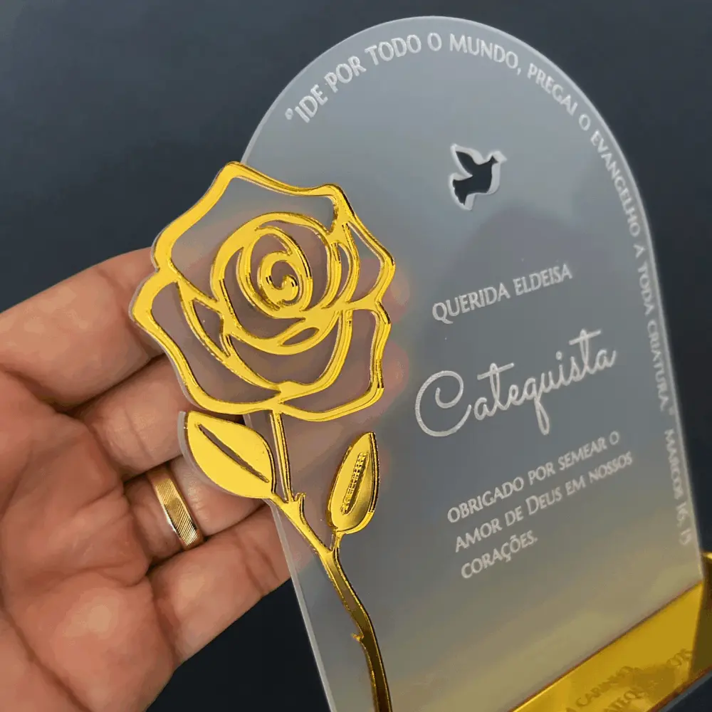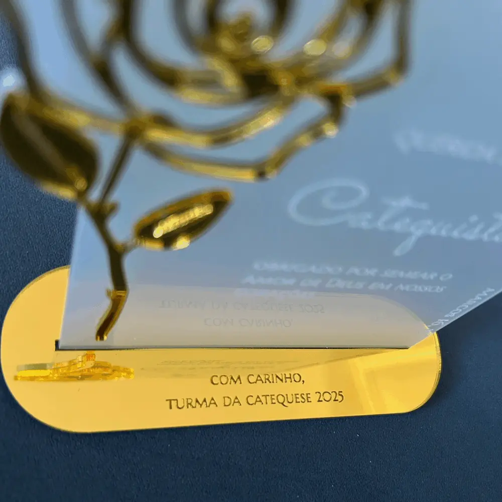 Placa homenagem em acrílico, personalizada com aplique e gravação.