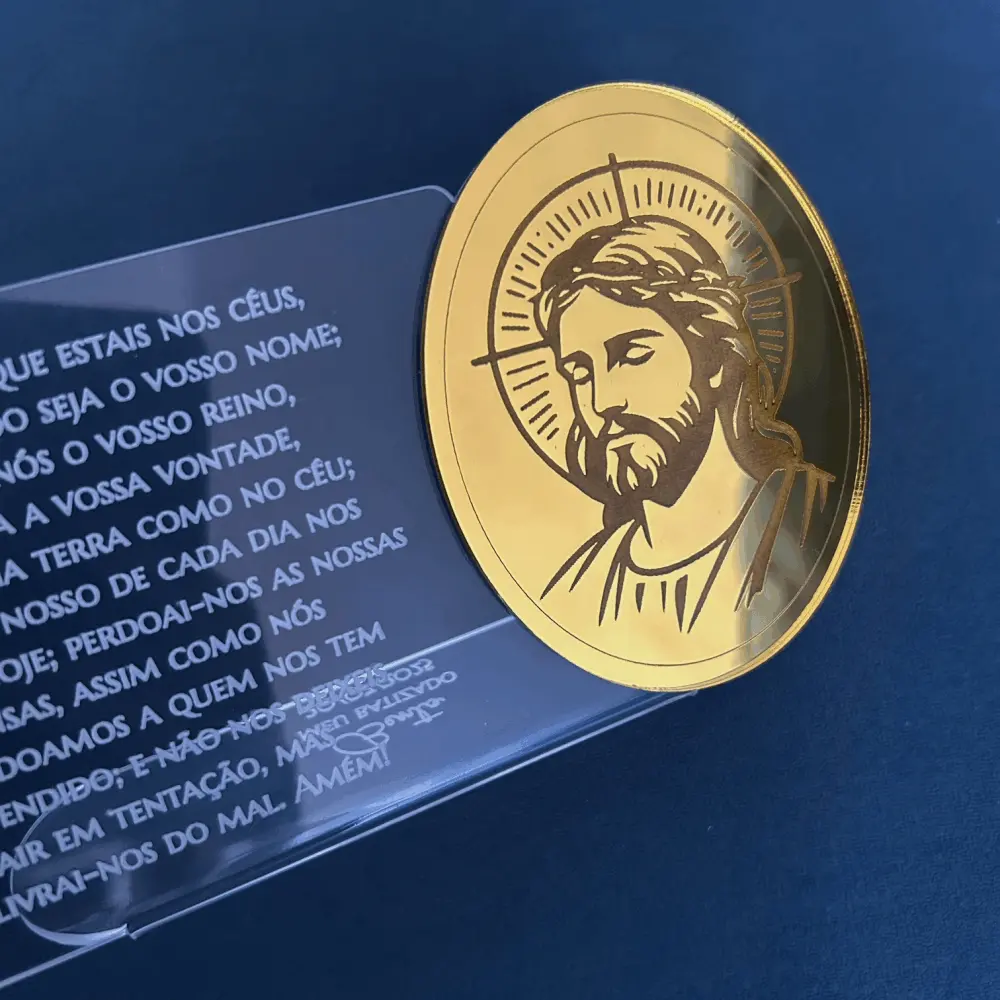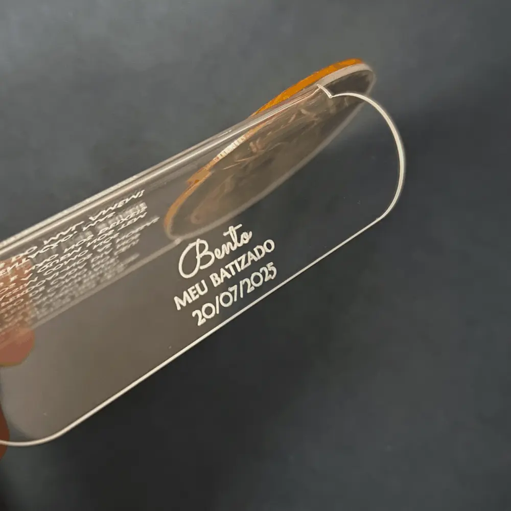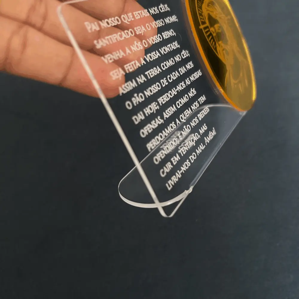 Placa em acrílico cristal, personalizada com aplique e gravação. Ideal para lembrança de Primeira Comunhão/Eucaristia, Batizado ou Crisma.