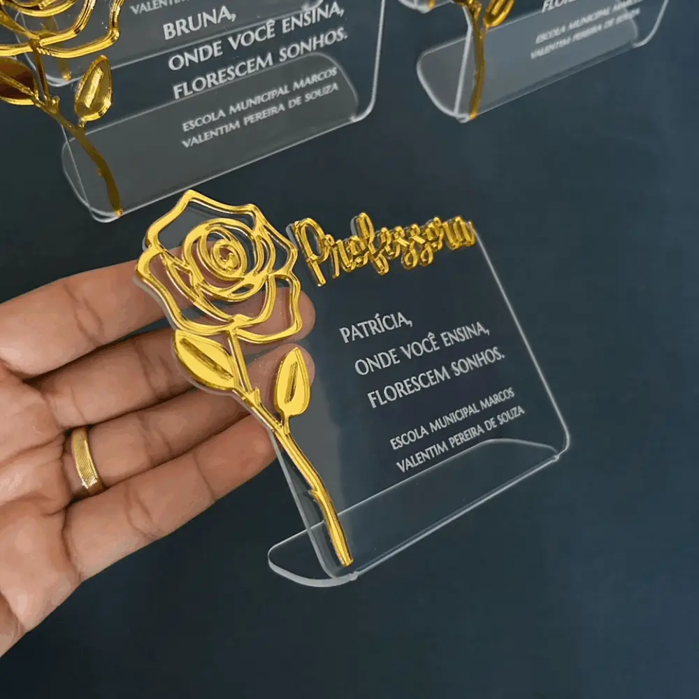 Placa de acrílico cristal, personalizada com aplique e gravação.