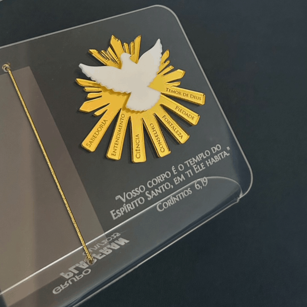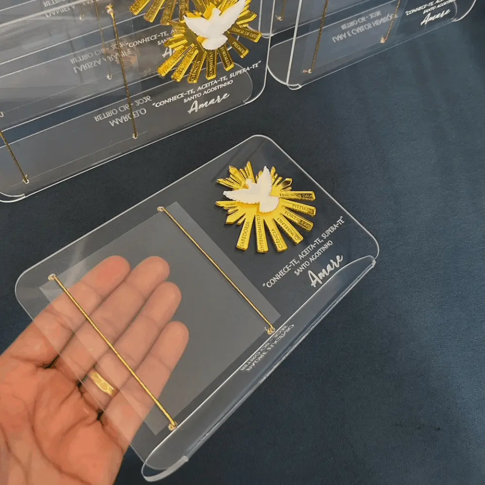 Porta-retrato no acrílico cristal, personalizado com aplique e gravação. Ideal para Batizado, Primeira Eucaristia ou Crisma.
