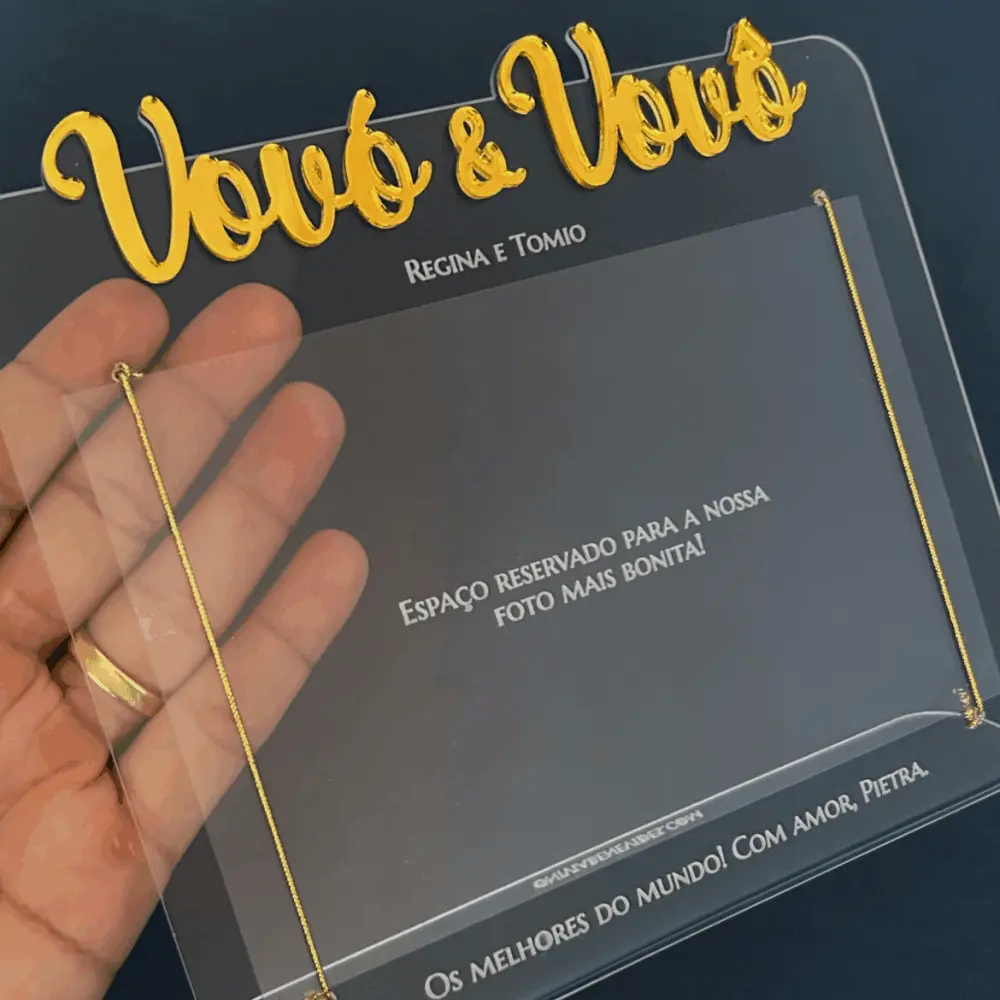 Porta-retrato em acrílico cristal, personalizado com gravação e aplique de acrílico espelhado.